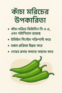 কাঁচা মরিচ শুধু রান্নায় ঝাল নয়, স্বাস্থ্যের জন্যও এক আশীর্বাদ। এতে রয়েছে প্রচুর ভিটামিন সি, ভিটামিন এ, ক্যালসিয়াম, আয়রন ও পটাশিয়াম, যা রোগপ্রতিরোধ ক্ষমতা বৃদ্ধি, ত্বকের উজ্জ্বলতা ও রক্ত সঞ্চালন উন্নত করতে সহায়তা করে।